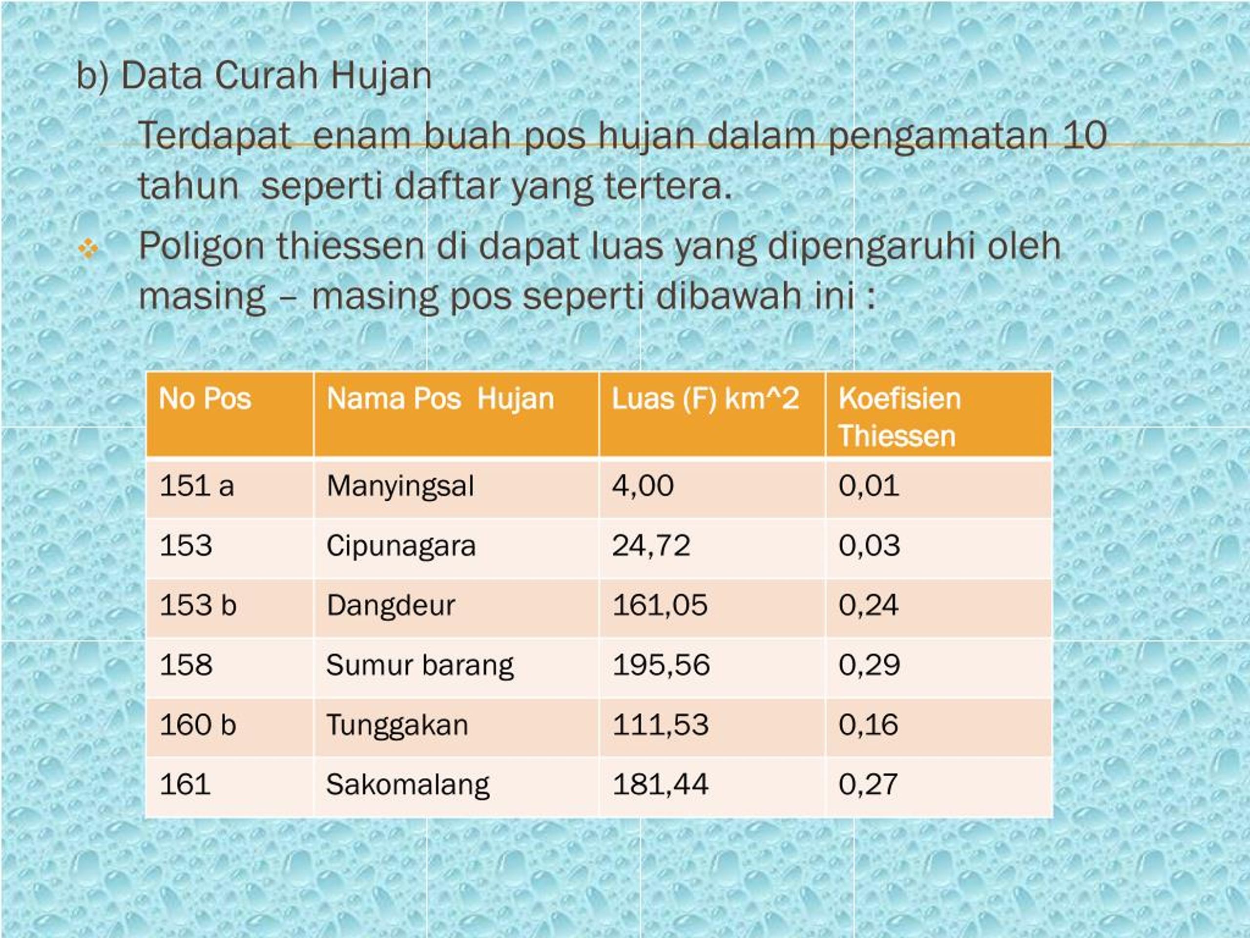 b) Data CurahHujan Terdapatenambuah pos hujandalampengamatan 10 tahunsepertidaftar yang tertera. • Poligonthiessendidapatluas yang dipengaruhiolehmasing – masing pos sepertidibawahini :
