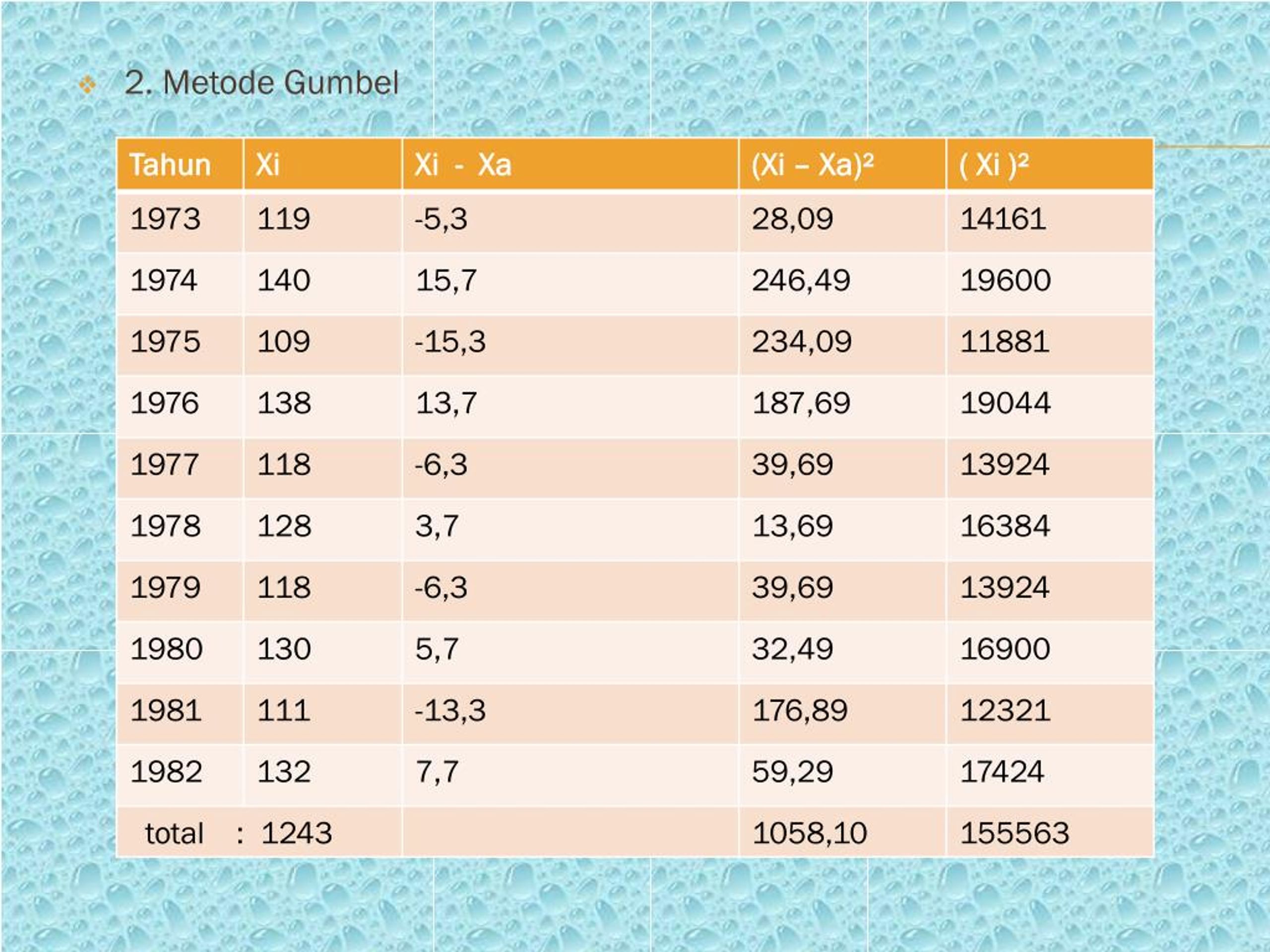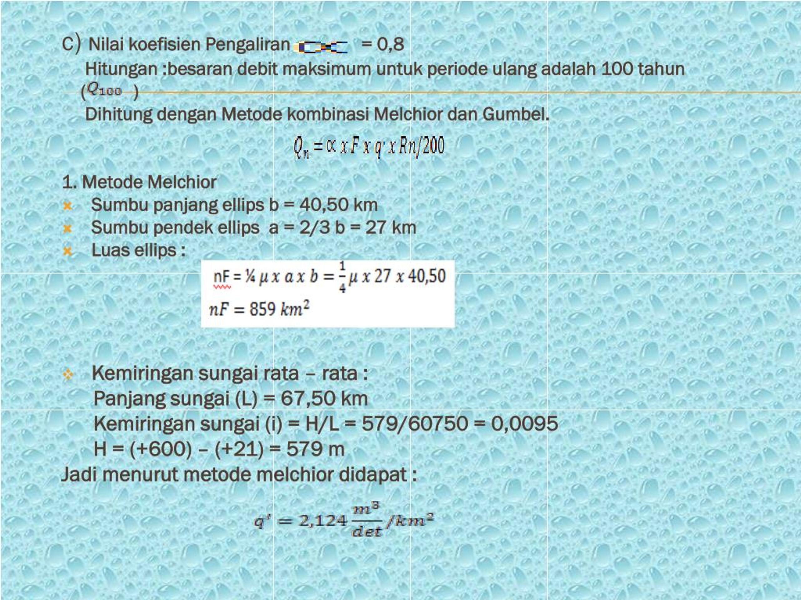 Xa = = 1243 / 10 = 124,3 • Jadi, menurutmetodegumbeldidapatRn =171,17mm • Perhitungan debit maksimumdenganmenggunakanmetodekombinasi Melchior danGumbel Qn = α x F x q x Rn/200 Q100 = 0,80 x 678,30 x 2,124 x 171,17/200 = 986 m3/det