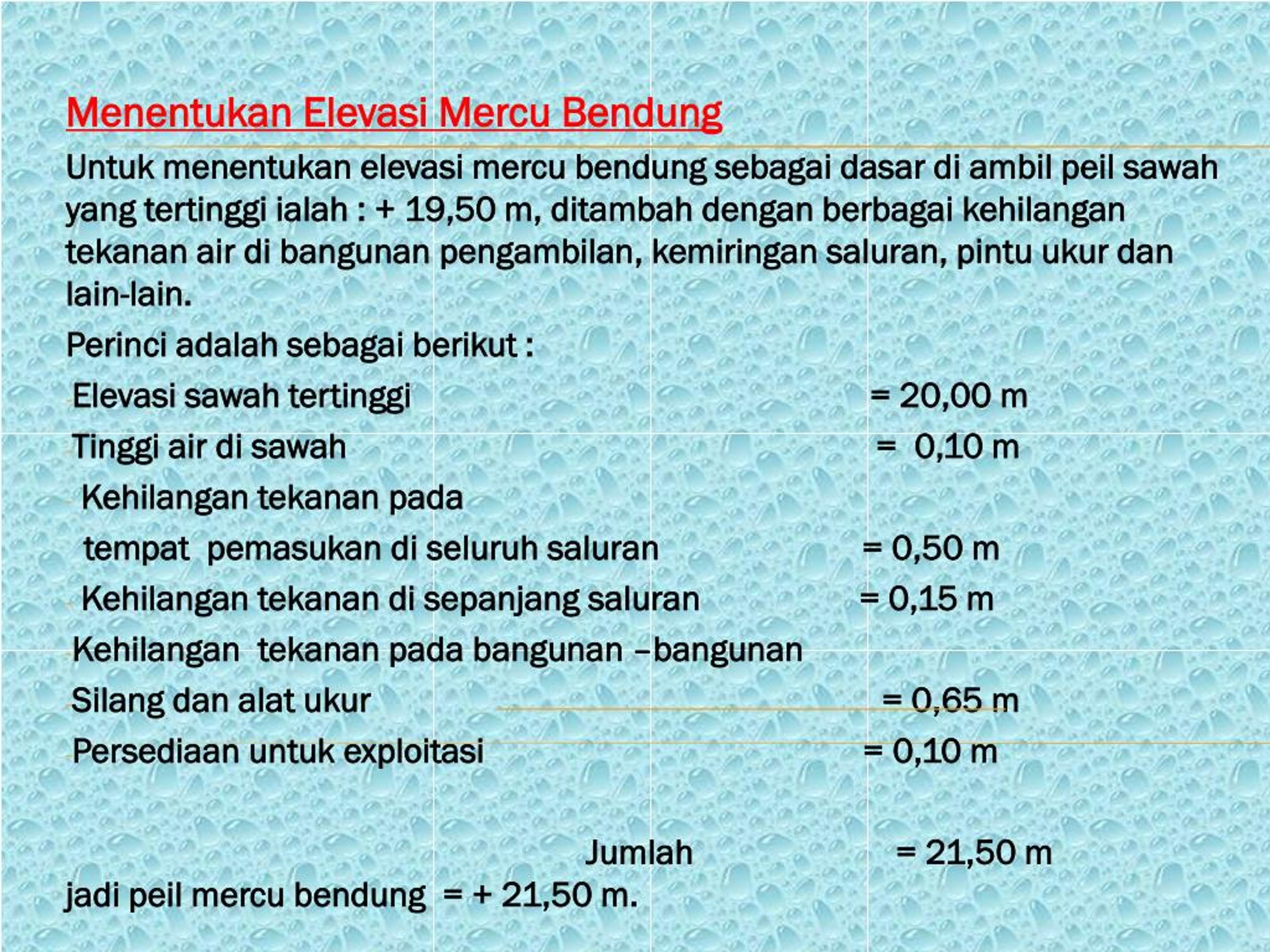 MenentukanElevasiMercuBendung Untukmenentukanelevasimercubendungsebagaidasardiambilpeilsawah yang tertinggiialah : + 19,50 m, ditambahdenganberbagaikehilangantekanan air dibangunanpengambilan, kemiringansaluran, pintuukurdan lain-lain. Perinciadalahsebagaiberikut : Elevasisawahtertinggi = 20,00 m Tinggi air disawah = 0,10 m Kehilangantekananpada tempatpemasukandiseluruhsaluran = 0,50 m Kehilangantekanandisepanjangsaluran = 0,15 m Kehilangantekananpadabangunan –bangunan Silangdanalatukur = 0,65 m Persediaanuntukexploitasi = 0,10 m Jumlah = 21,50 m jadipeilmercubendung = + 21,50 m.