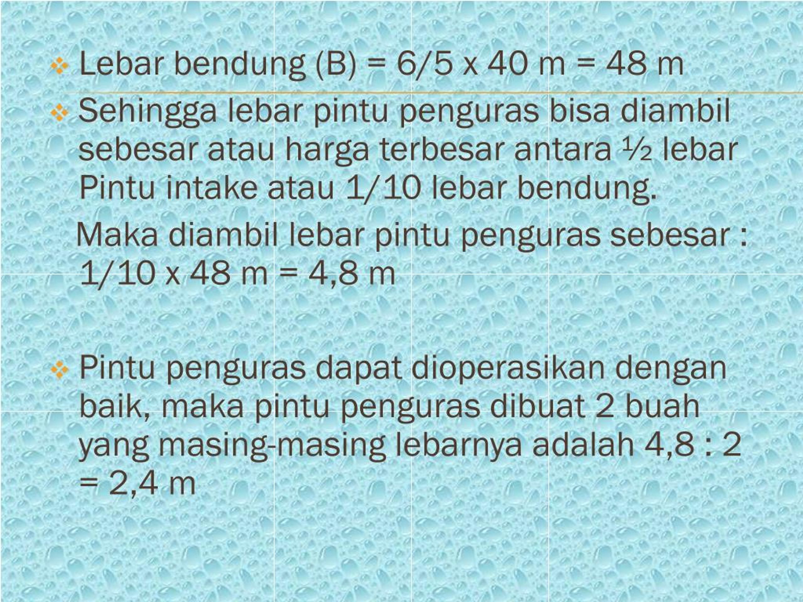 Lebarbendung (B) = 6/5 x 40 m = 48 m • Sehinggalebarpintupengurasbisadiambilsebesaratauhargaterbesarantara ½ lebarPintu intake atau1/10 lebar bendung. Maka diambil lebar pintu penguras sebesar : 1/10 x 48 m = 4,8 m • Pintupengurasdapatdioperasikandenganbaik, makapintupengurasdibuat 2 buah yang masing-masinglebarnyaadalah 4,8 : 2 = 2,4 m