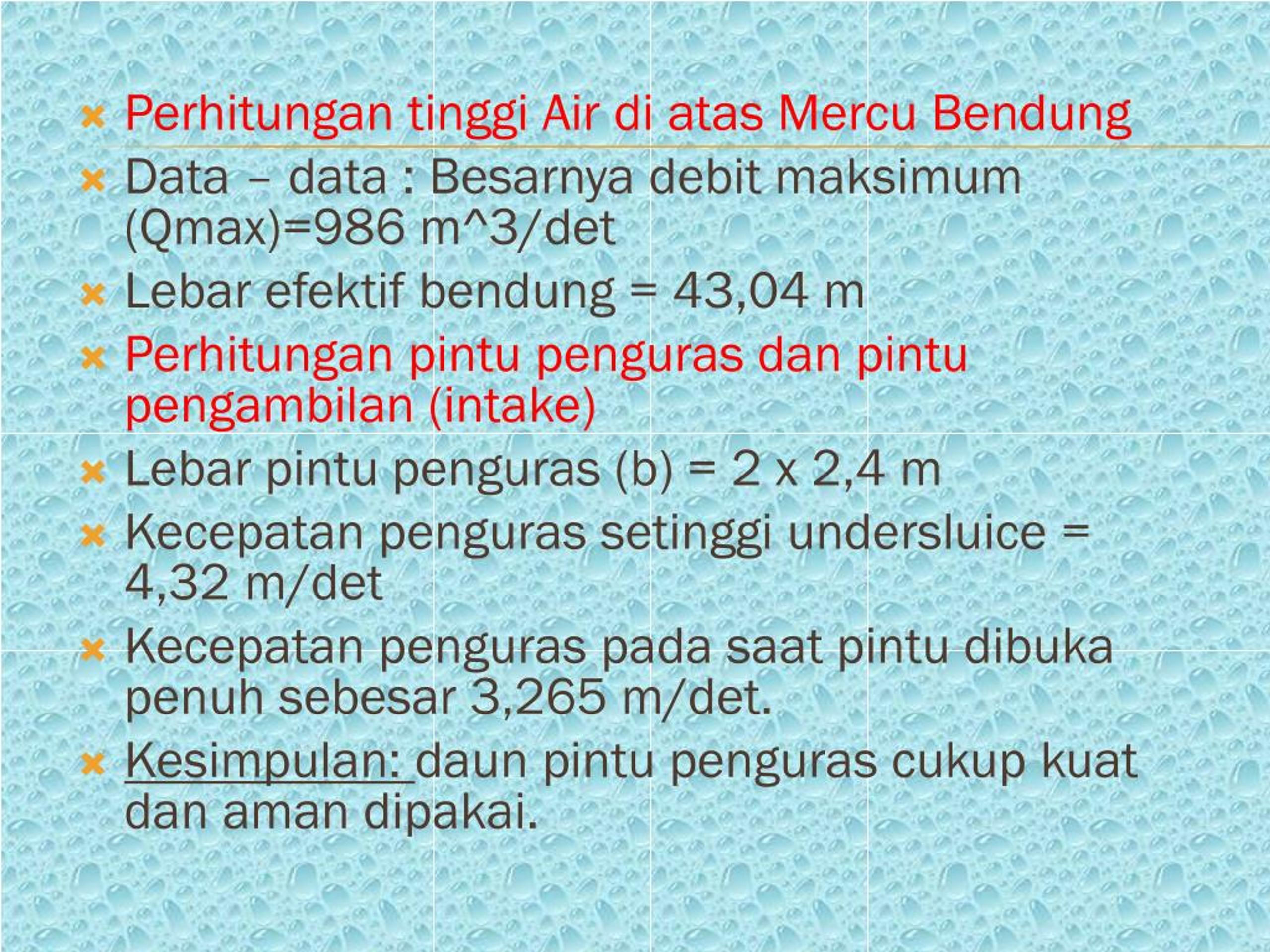 Perhitungantinggi Air diatasMercuBendung Data – data : Besarnya debit maksimum (Qmax)=986 m^3/det Lebarefektifbendung = 43,04 m Perhitunganpintupengurasdanpintupengambilan (intake) Lebarpintupenguras (b) = 2 x 2,4 m Kecepatanpengurassetinggiundersluice = 4,32 m/det Kecepatanpenguraspadasaatpintudibukapenuhsebesar 3,265 m/det. Kesimpulan: daunpintupengurascukupkuatdanamandipakai.