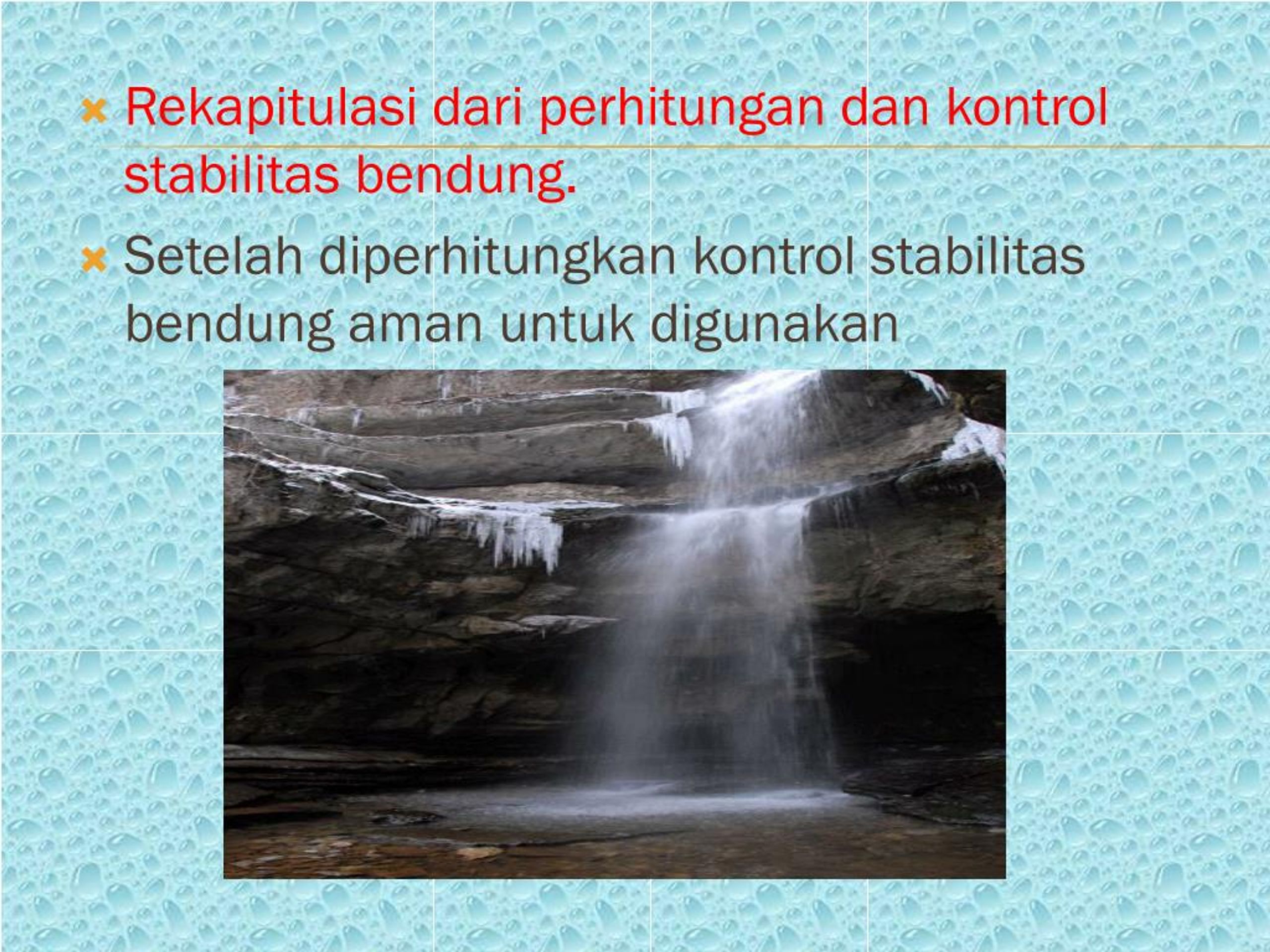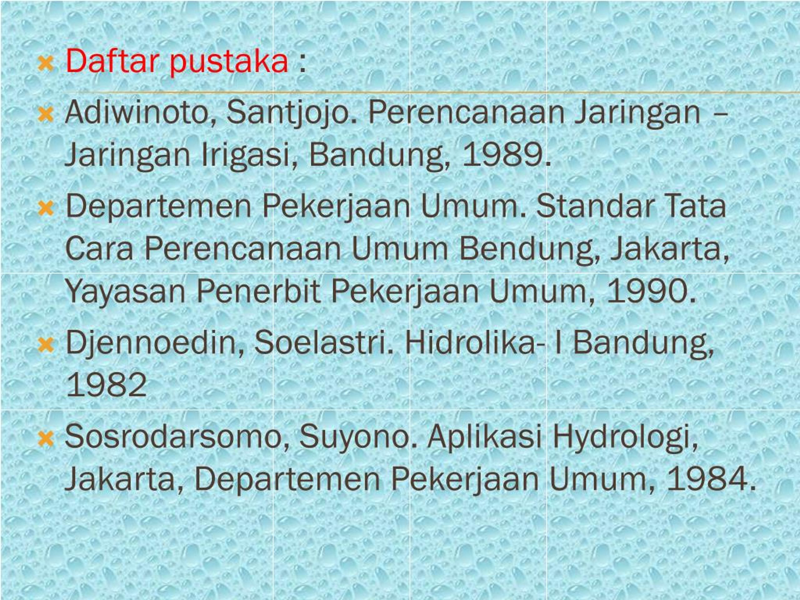 Daftarpustaka: Adiwinoto, Santjojo. PerencanaanJaringan – JaringanIrigasi, Bandung, 1989. DepartemenPekerjaanUmum. Standar Tata Cara PerencanaanUmumBendung, Jakarta, YayasanPenerbitPekerjaanUmum, 1990. Djennoedin, Soelastri. Hidrolika- I Bandung, 1982 Sosrodarsomo, Suyono. AplikasiHydrologi, Jakarta, DepartemenPekerjaanUmum, 1984.
