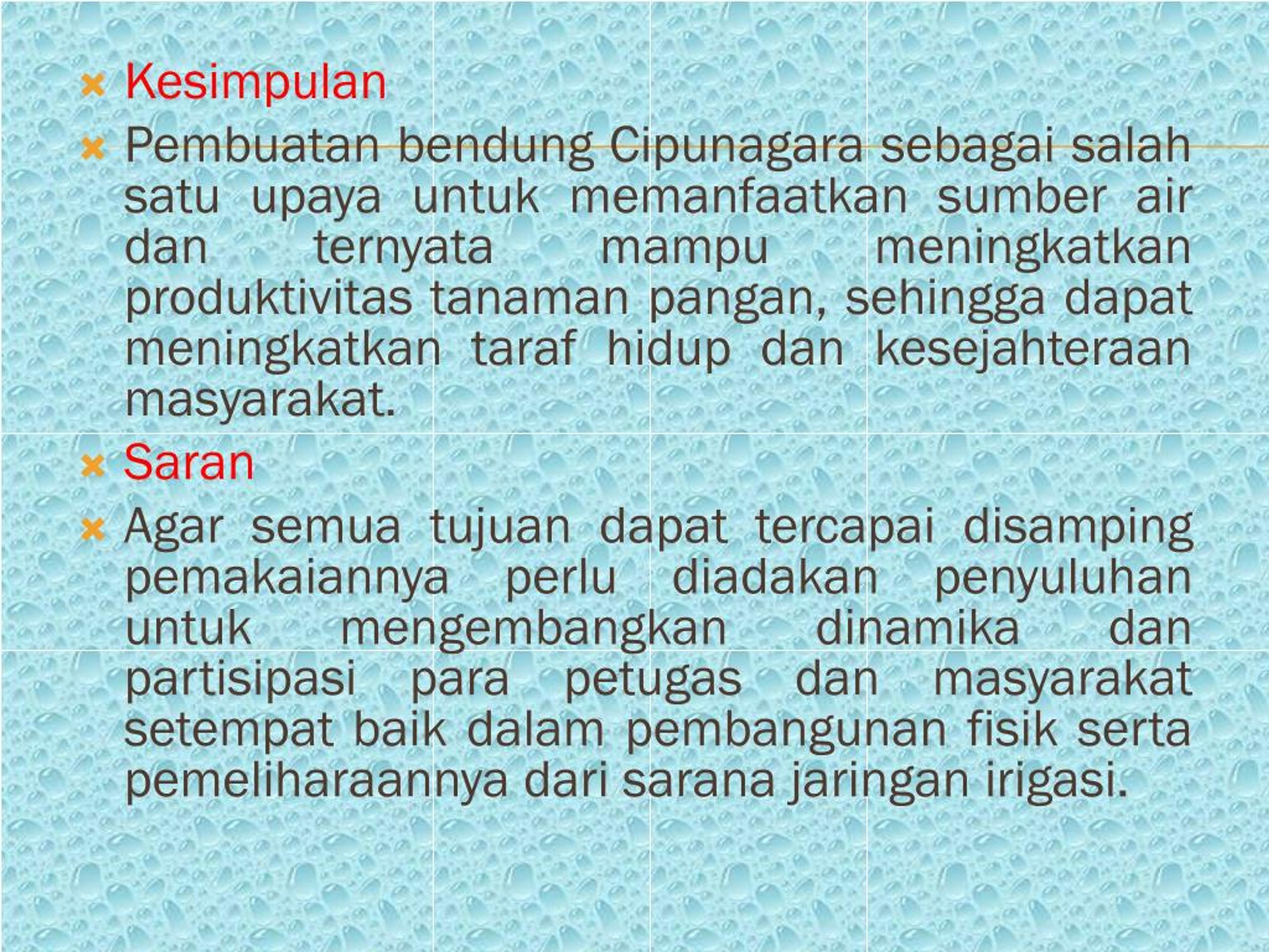 Kesimpulan PembuatanbendungCipunagarasebagaisalahsatuupayauntukmemanfaatkansumber air danternyatamampumeningkatkanproduktivitastanamanpangan, sehinggadapatmeningkatkantarafhidupdankesejahteraanmasyarakat. Saran Agar semuatujuandapattercapaidisampingpemakaiannyaperludiadakanpenyuluhanuntukmengembangkandinamikadanpartisipasiparapetugasdanmasyarakatsetempatbaikdalampembangunanfisiksertapemeliharaannyadarisaranajaringanirigasi.