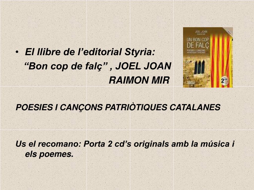 El llibre de l’editorial Styria: “Bon cop de falç” , JOEL JOAN RAIMON MIR POESIES I CANÇONS PATRIÒTIQUES CATALANES Us el recomano: Porta 2 cd’s originals amb la música i els poemes.