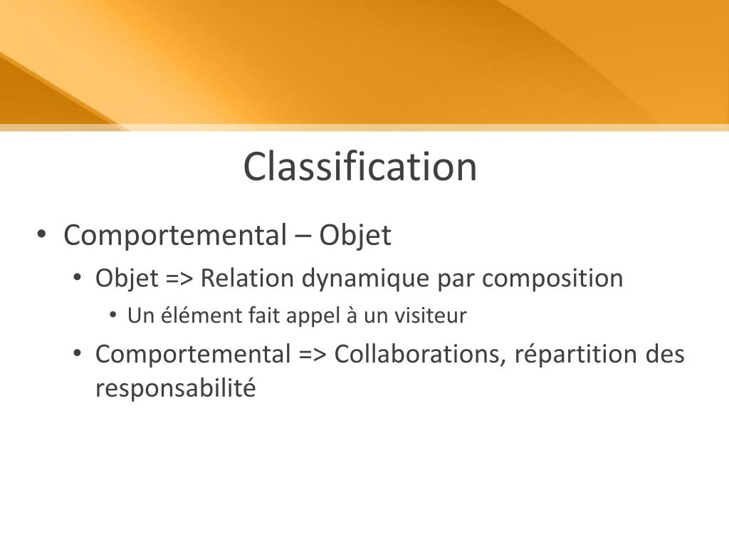 Classification • Comportemental – Objet • Objet => Relation dynamique par composition • Un élément fait appel à un visiteur • Comportemental => Collaborations, répartition des responsabilité