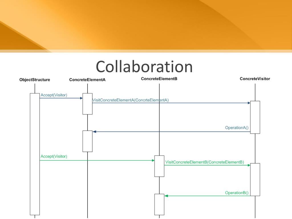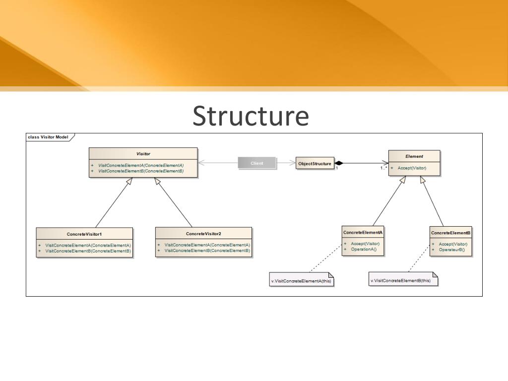 Constituant(2/2) • Visiteur concret • Implémente les opérations du Visiteur • Définit un contexte pour la visite et garde son état local • Elément concret • Implémente la méthode d’appel au visiteur • Se passe en paramètre à la bonne méthode du visiteur
