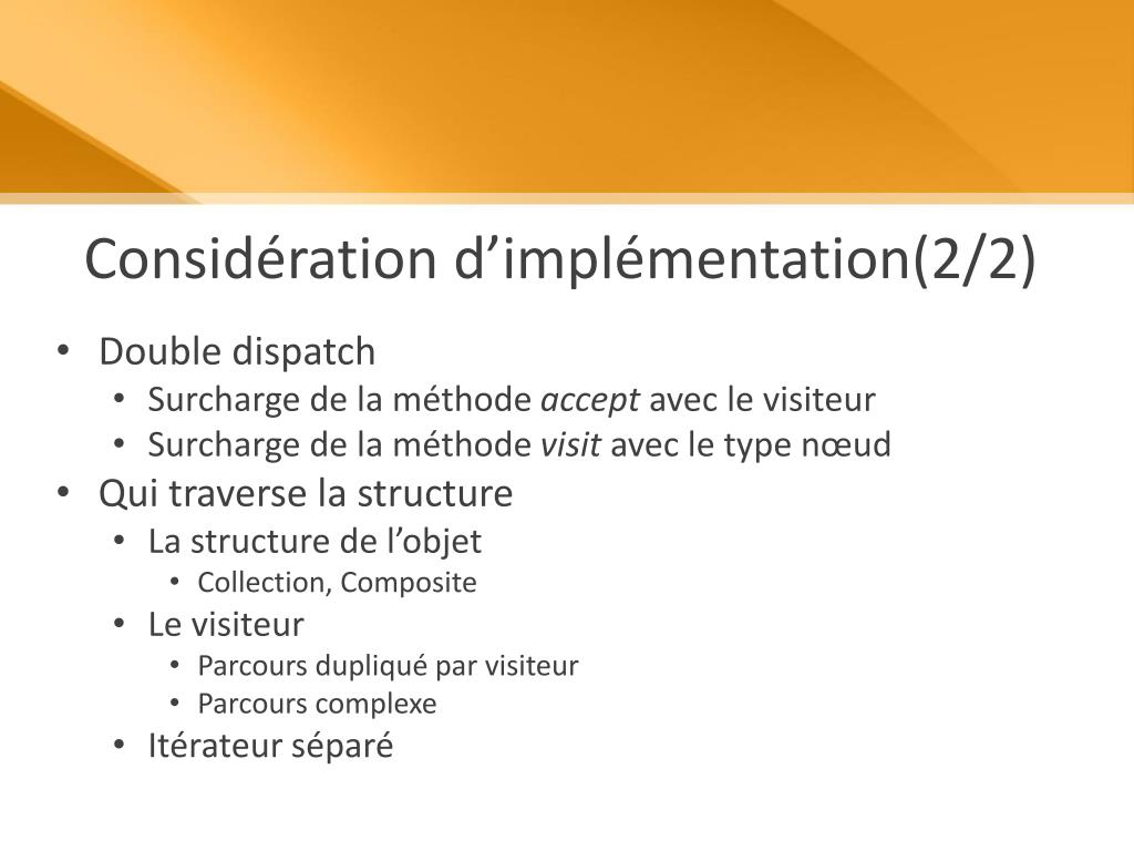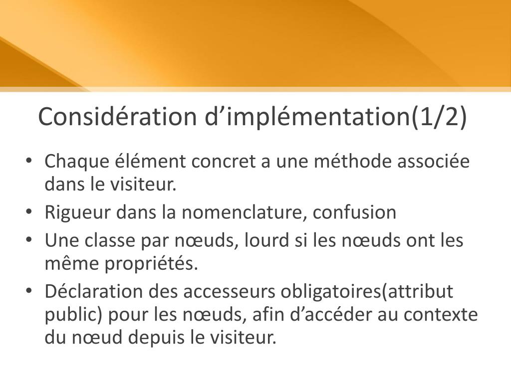 Considération d’implémentation(1/2) • Chaque élément concret a une méthode associée dans le visiteur. • Rigueur dans la nomenclature, confusion • Une classe par nœuds, lourd si les nœuds ont les même propriétés. • Déclaration des accesseurs obligatoires(attribut public) pour les nœuds, afin d’accéder au contexte du nœud depuis le visiteur.