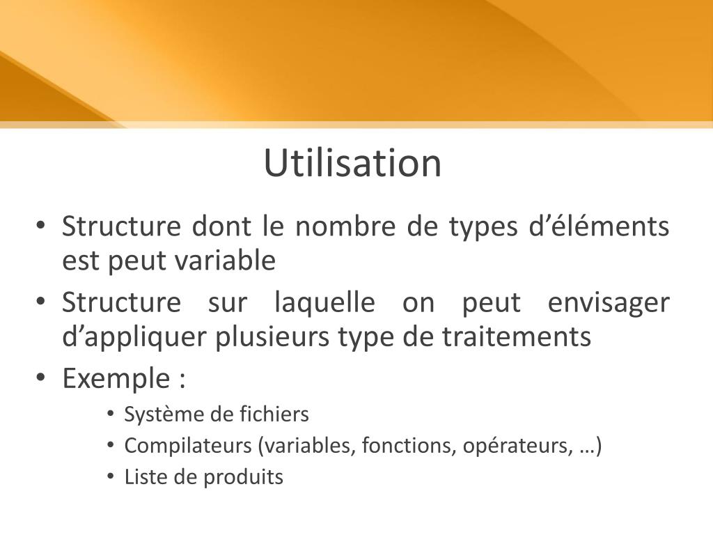 Utilisation • Structure dont le nombre de types d’éléments est peut variable • Structure sur laquelle on peut envisager d’appliquer plusieurs type de traitements • Exemple : • Système de fichiers • Compilateurs (variables, fonctions, opérateurs, …) • Liste de produits