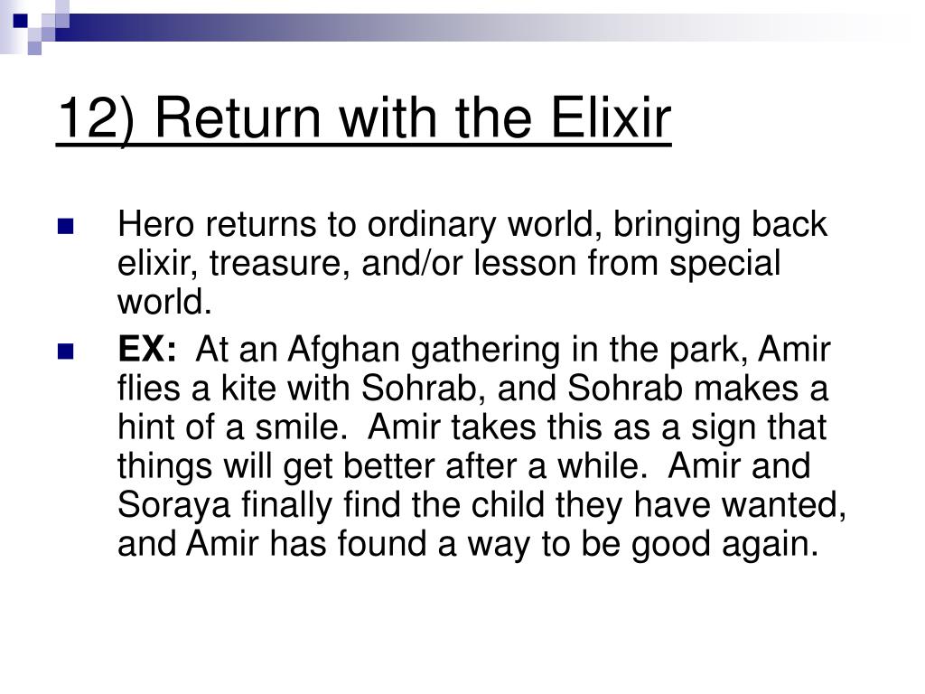 12) Return with the Elixir • Hero returns to ordinary world, bringing back elixir, treasure, and/or lesson from special world. • EX: At an Afghan gathering in the park, Amir flies a kite with Sohrab, and Sohrab makes a hint of a smile. Amir takes this as a sign that things will get better after a while. Amir and Soraya finally find the child they have wanted, and Amir has found a way to be good again.