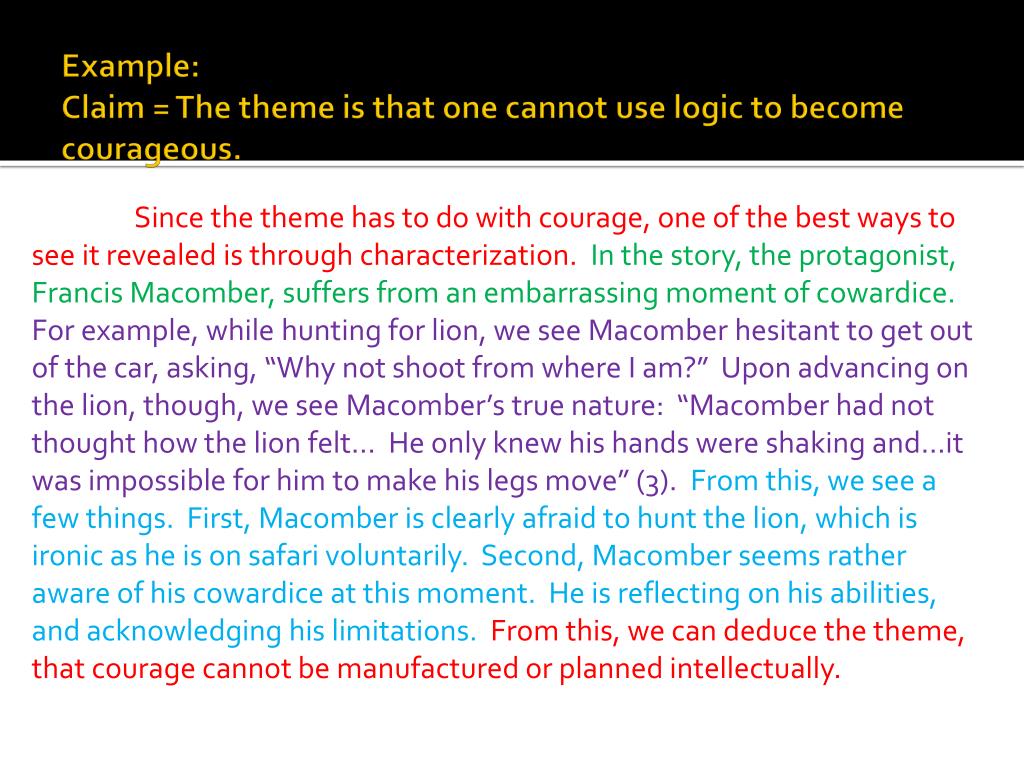 Example: Claim = The theme is that one cannot use logic to become courageous. Since the theme has to do with courage, one of the best ways to see it revealed is through characterization. In the story, the protagonist, Francis Macomber, suffers from an embarrassing moment of cowardice. For example, while hunting for lion, we see Macomber hesitant to get out of the car, asking, “Why not shoot from where I am?” Upon advancing on the lion, though, we see Macomber’s true nature: “Macomber had not thought how the lion felt… He only knew his hands were shaking and…it was impossible for him to make his legs move” (3). From this, we see a few things. First, Macomber is clearly afraid to hunt the lion, which is ironic as he is on safari voluntarily. Second, Macomber seems rather aware of his cowardice at this moment. He is reflecting on his abilities, and acknowledging his limitations. From this, we can deduce the theme, that courage cannot be manufactured or planned intellectually.
