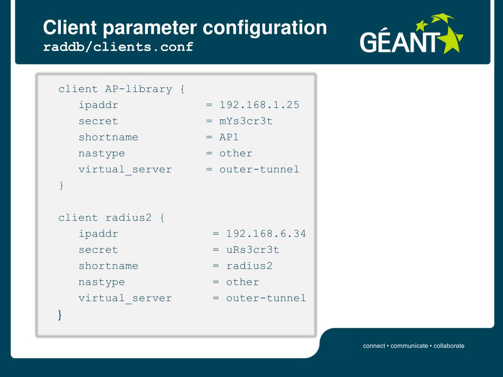 Client parameter configurationraddb/clients.conf client AP-library { ipaddr = 192.168.1.25 secret = mYs3cr3t shortname = AP1 nastype = other virtual_server = outer-tunnel } client radius2 { ipaddr = 192.168.6.34 secret = uRs3cr3t shortname = radius2 nastype = other virtual_server = outer-tunnel }