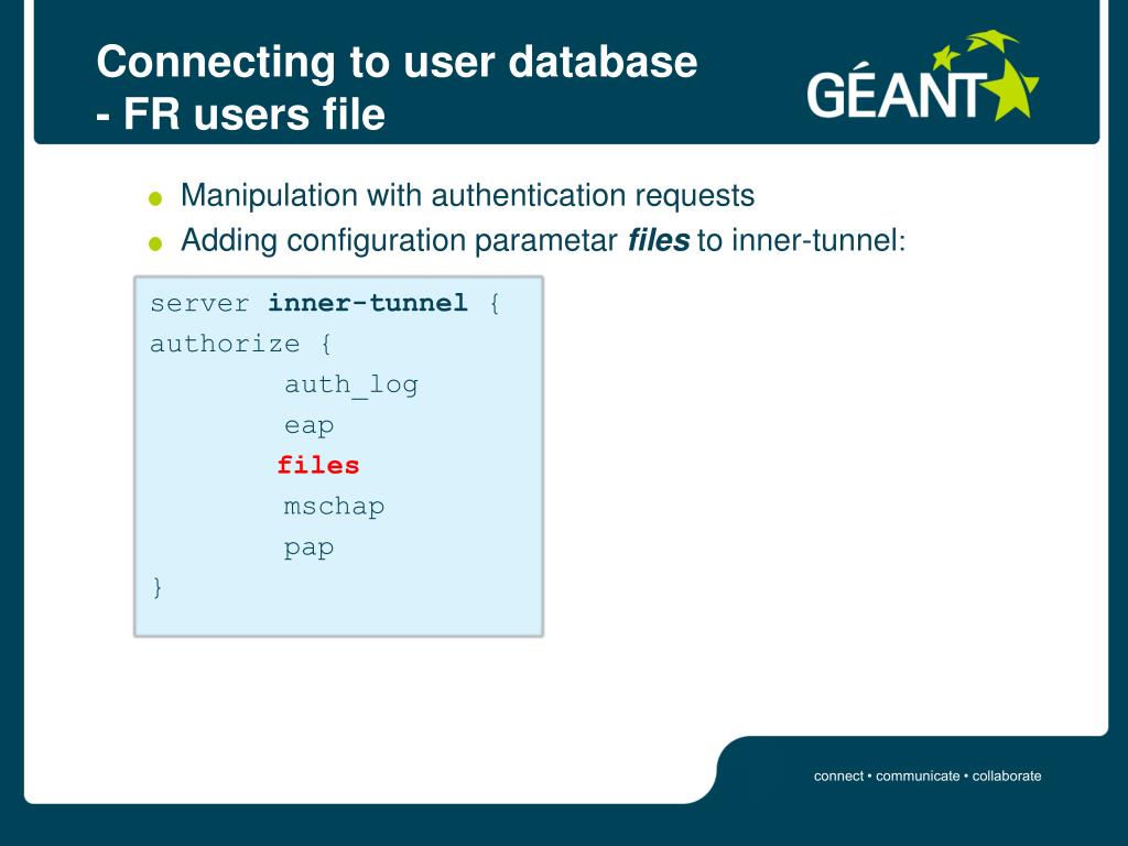 Connecting to user database- FR users file • Manipulation with authentication requests • Adding configuration parametar files to inner-tunnel: server inner-tunnel { authorize { auth_log eap files mschap pap }