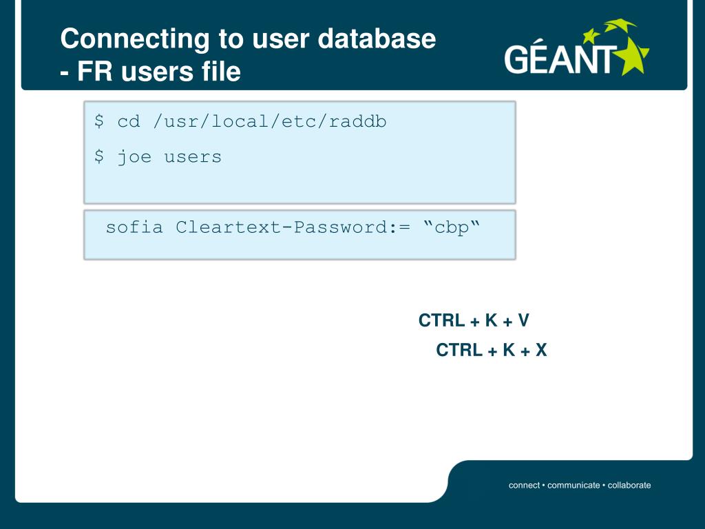 Connecting to user database- FR users file $ cd /usr/local/etc/raddb $ joe users sofiaCleartext-Password:= “cbp“ CTRL + K + V CTRL + K + X