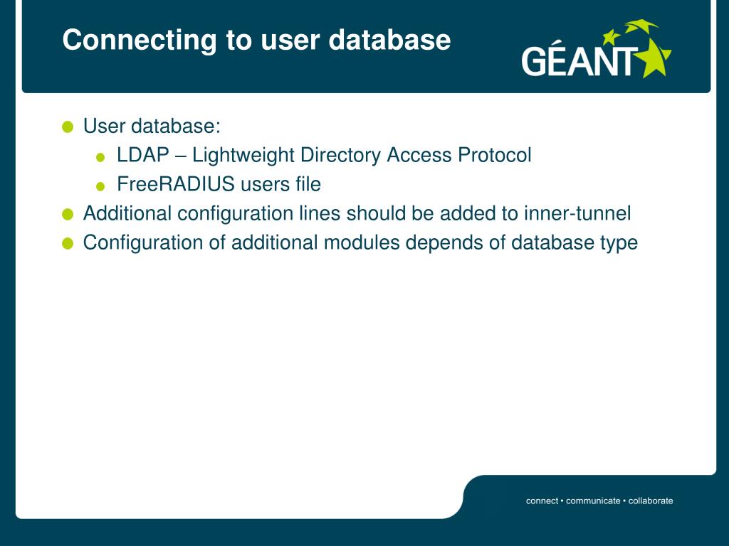 Connecting to user database • User database: • LDAP – Lightweight Directory Access Protocol • FreeRADIUS users file • Additional configuration lines should be added to inner-tunnel • Configuration of additional modules depends of database type