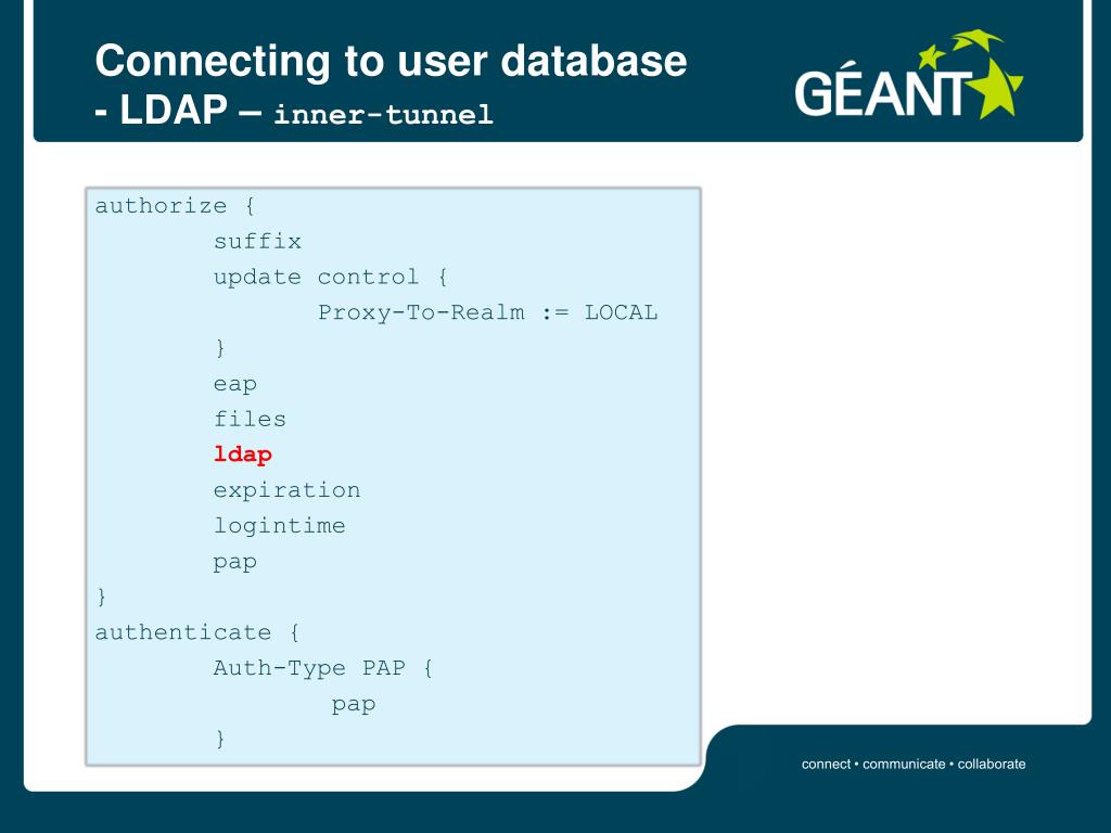 Connecting to user database- LDAP – inner-tunnel authorize { suffix update control { Proxy-To-Realm := LOCAL } eap files ldap expiration logintime pap } authenticate { Auth-Type PAP { pap }