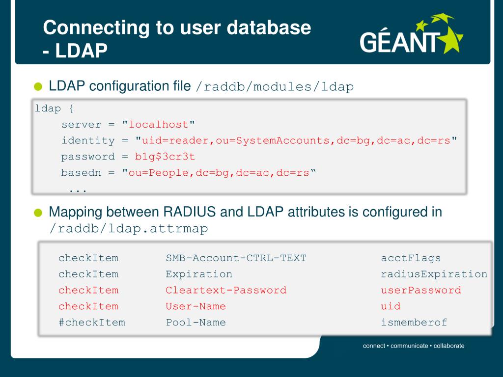 Connecting to user database- LDAP • LDAP configuration file /raddb/modules/ldap ldap { server = "localhost" identity = "uid=reader,ou=SystemAccounts,dc=bg,dc=ac,dc=rs" password = b1g$3cr3t basedn = "ou=People,dc=bg,dc=ac,dc=rs“ ... • Mapping between RADIUS and LDAP attributes is configured in/raddb/ldap.attrmap checkItem SMB-Account-CTRL-TEXT acctFlags checkItem Expiration radiusExpiration checkItem Cleartext-Password userPassword checkItem User-Name uid #checkItem Pool-Name ismemberof