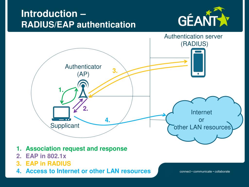 Introduction – RADIUS/EAP authentication Authentication server (RADIUS) Authenticator (AP) 3. 1. 2. Internet or other LAN resources 4. Supplicant Association request and response EAP in 802.1x EAP in RADIUS Access to Internet or other LAN resources