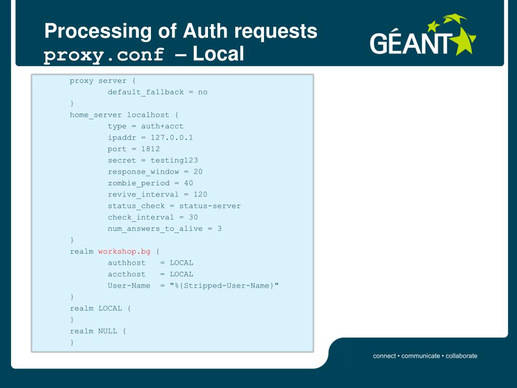 Processing of Auth requestsproxy.conf – Local proxy server { default_fallback = no } home_server localhost { type = auth+acct ipaddr = 127.0.0.1 port = 1812 secret = testing123 response_window = 20 zombie_period = 40 revive_interval = 120 status_check = status-server check_interval = 30 num_answers_to_alive = 3 } realm workshop.bg { authhost = LOCAL accthost = LOCAL User-Name = "%{Stripped-User-Name}" } realm LOCAL { } realm NULL { }