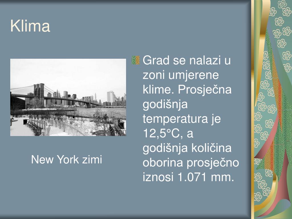 Klima • Grad se nalazi u zoni umjerene klime. Prosječna godišnja temperatura je 12,5°C, a godišnja količina oborina prosječno iznosi 1.071 mm. New York zimi