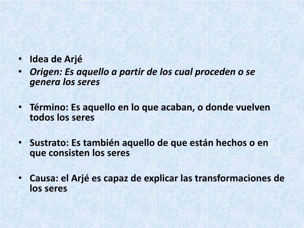 Idea de Arjé • Origen: Es aquello a partir de los cual proceden o se genera los seres • Término: Es aquello en lo que acaban, o donde vuelven todos los seres • Sustrato: Es también aquello de que están hechos o en que consisten los seres • Causa: el Arjé es capaz de explicar las transformaciones de los seres