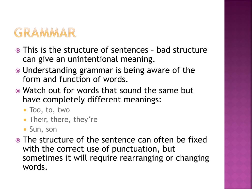 Grammar • This is the structure of sentences – bad structure can give an unintentional meaning. • Understanding grammar is being aware of the form and function of words. • Watch out for words that sound the same but have completely different meanings: • Too, to, two • Their, there, they’re • Sun, son • The structure of the sentence can often be fixed with the correct use of punctuation, but sometimes it will require rearranging or changing words.