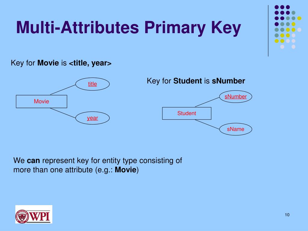 Multi-Attributes Primary Key Key for Movie is <title, year> Key for Student is sNumber We can represent key for entity type consisting of more than one attribute (e.g.: Movie)