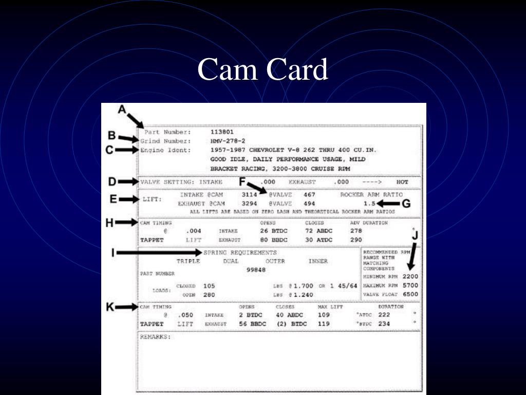 Camshaft Design and Theory. Camshaft. The “brain” of the engine Controls valvetrain operation Rotates at ½ crankshaft speed Along with the crankshaft it determines firing order Along with the induction and exhaust systems it determines the useful rpm range of the engine. Camshaft Design.