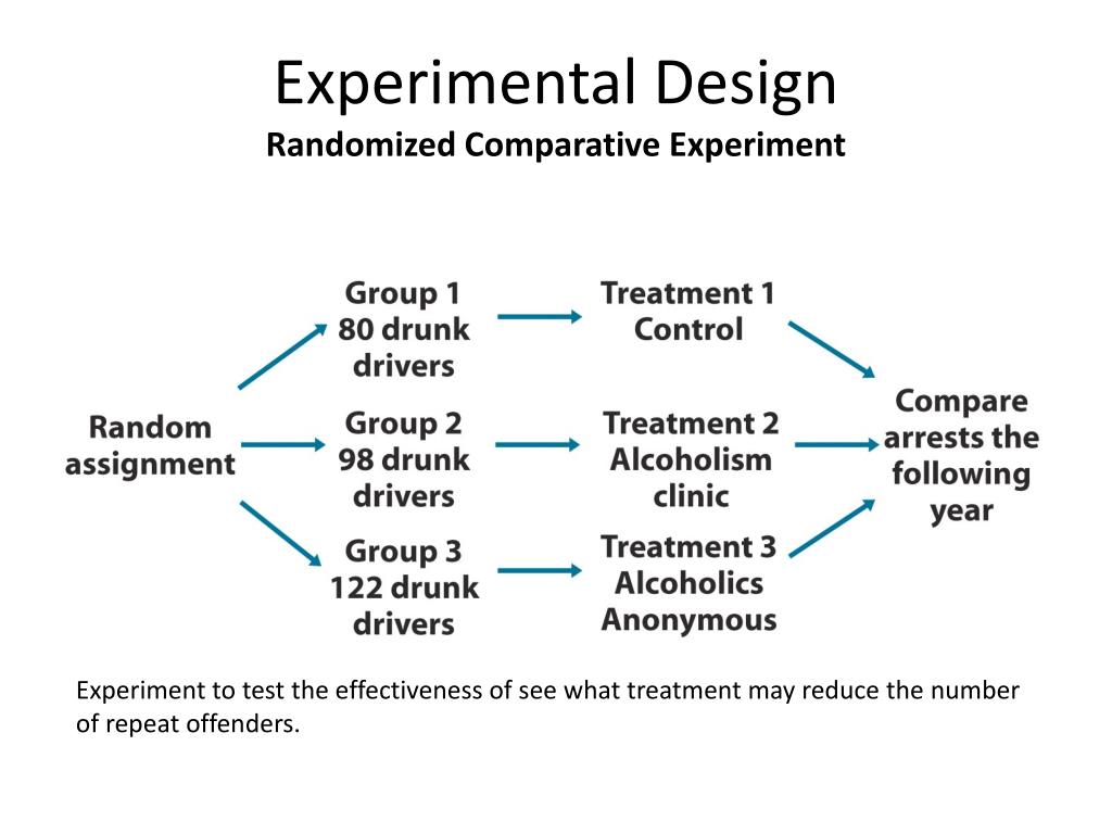 Experimental DesignRandomized Comparative Experiment Experiment to test the effectiveness of see what treatment may reduce the number of repeat offenders.