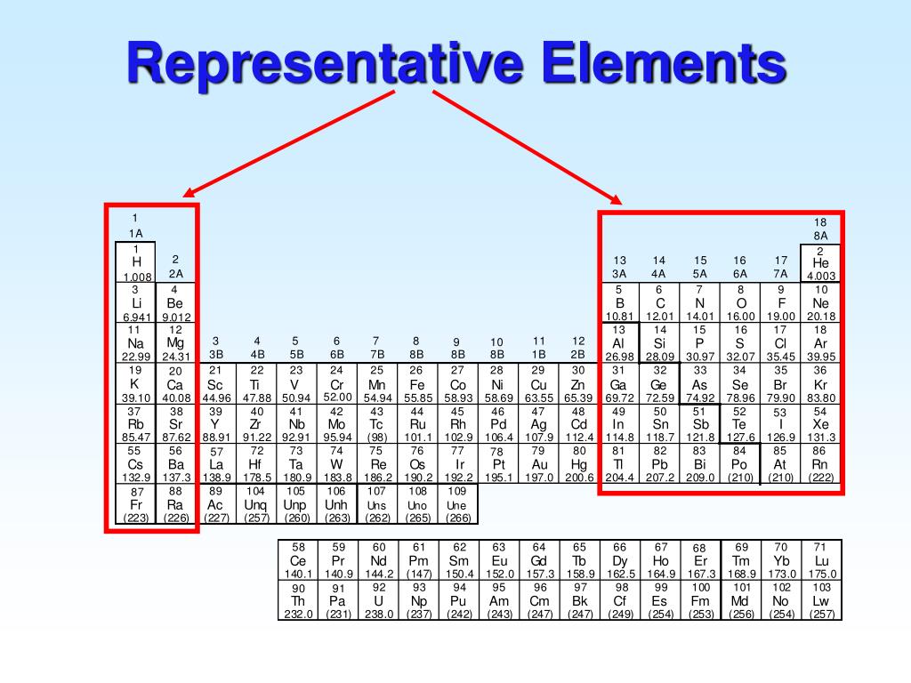 Groups • referred to by number or top element • some have names: The Representative Elements • alkali metals - group 1A • alkaline earth metals - group 2A • noble gases - group 8A • halogens - group 7A • chalcogens - group 6A • pnictogens - group 5A