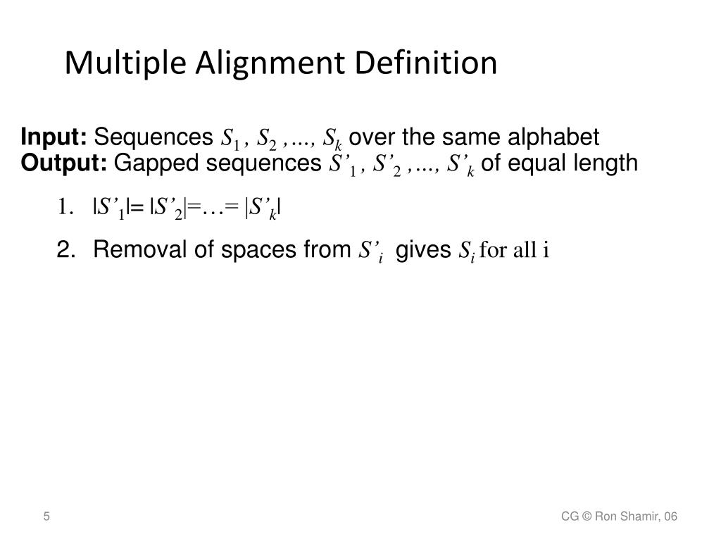 Multiple Alignment Definition Input: Sequences S1, S2,…, Sk over the same alphabet Output: Gapped sequences S’1, S’2,…, S’k of equal length • |S’1|= |S’2|=…= |S’k| • Removal of spaces from S’igives Si for all i