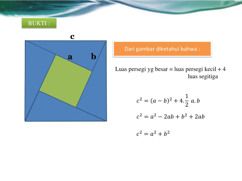 BUKTI : c Dari gambardiketahuibahwa : b a Luas persegi yg besar = luas persegi kecil + 4 luas segitiga