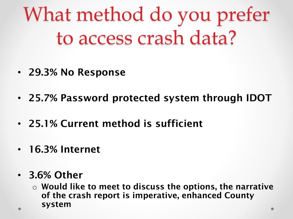 What method do you prefer to access crash data? • 29.3% No Response • 25.7% Password protected system through IDOT • 25.1% Current method is sufficient • 16.3% Internet • 3.6% Other • Would like to meet to discuss the options, the narrative of the crash report is imperative, enhanced County system