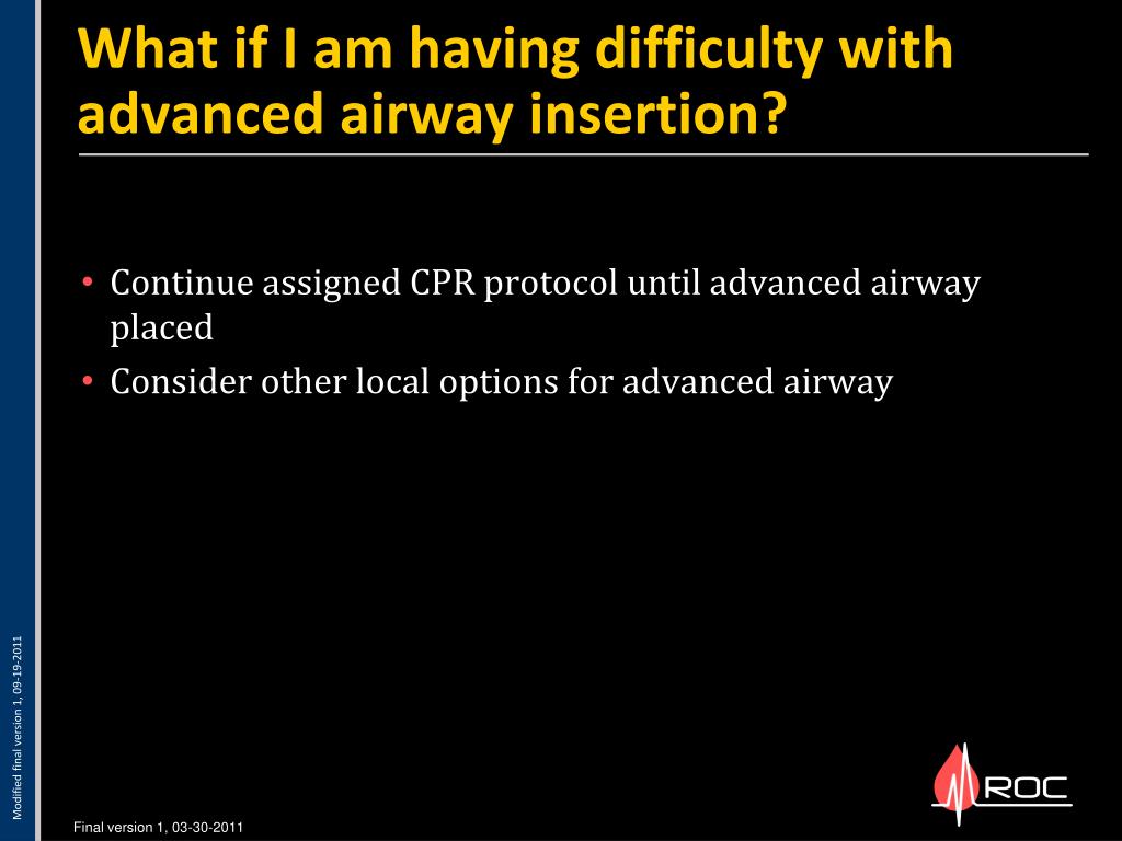 What if I am having difficulty with advanced airway insertion? • Continue assigned CPR protocol until advanced airway placed • Consider other local options for advanced airway Modified final version 1, 09-19-2011