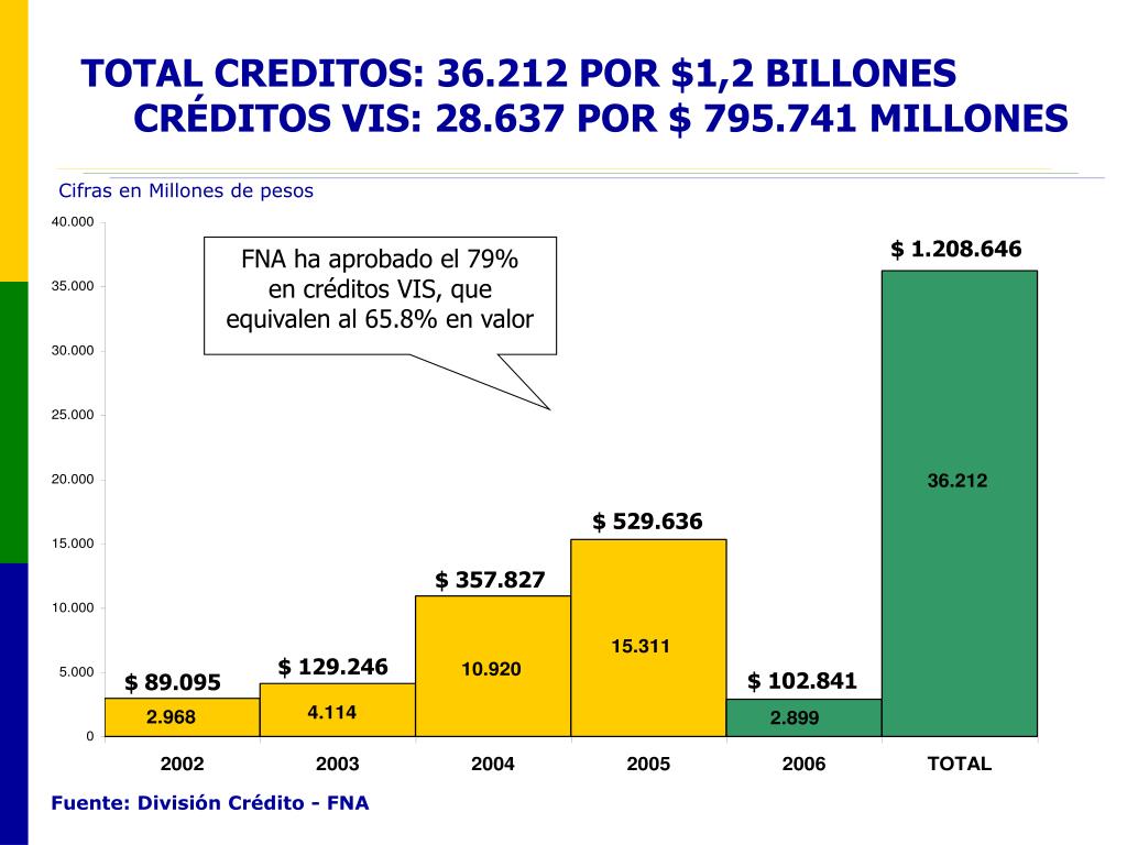 TOTAL CREDITOS: 36.212 POR $1,2 BILLONES CRÉDITOS VIS: 28.637 POR $ 795.741 MILLONES Cifras en Millones de pesos $ 1.208.646 FNA ha aprobado el 79% en créditos VIS, que equivalen al 65.8% en valor $ 529.636 $ 357.827 $ 129.246 $ 102.841 $ 89.095 Fuente: División Crédito - FNA