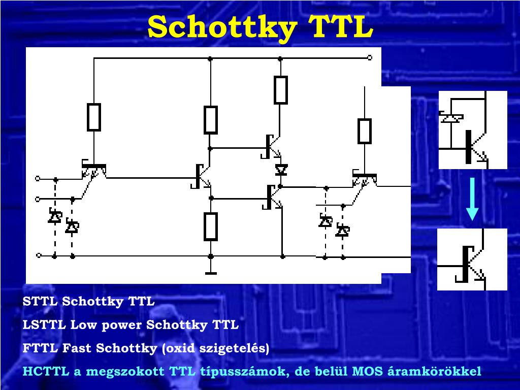 Schottky TTL STTL Schottky TTL LSTTL Low power Schottky TTL FTTL Fast Schottky (oxid szigetelés) HCTTL a megszokott TTL típusszámok, de belül MOS áramkörökkel