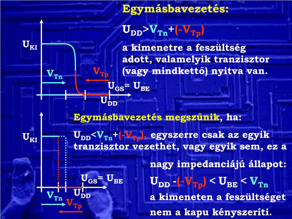 Egymásbavezetés: UDD>VTn+(-VTp) a kimenetre a feszültség adott, valamelyik tranzisztor (vagy mindkettő) nyitva van. UKI VTp VTn UGS= UBE UDD Egymásbavezetés megszűnik, ha: UDD<VTn+(-VTp), egyszerre csak az egyik tranzisztor vezethet, vagy egyik sem, ez a UKI nagy impedanciájú állapot: UDD-(-VTp)<UBE<VTn a kimeneten a feszültséget nem a kapu kényszeríti. UGS= UBE UDD VTn VTp