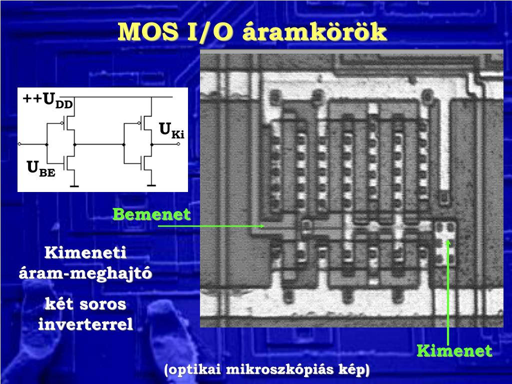 MOS I/O áramkörök Kimeneti áram-meghajtó két soros inverterrel Bemenet Kimenet ++UDD UKi UBE Elektron-mikroszkópos felvétel
