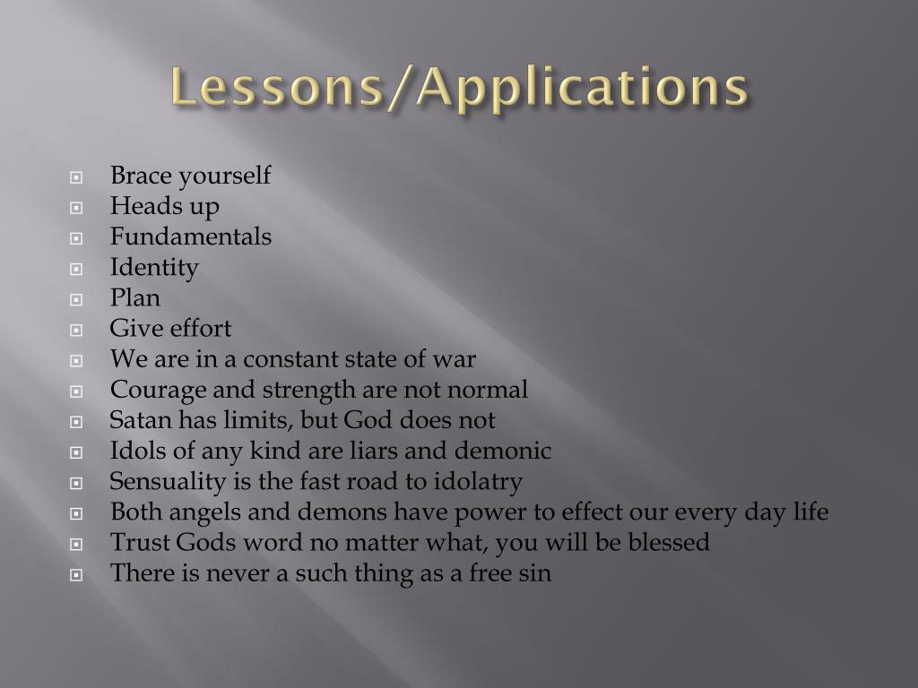 Lessons/Applications • Brace yourself • Heads up • Fundamentals • Identity • Plan • Give effort • We are in a constant state of war • Courage and strength are not normal • Satan has limits, but God does not • Idols of any kind are liars and demonic • Sensuality is the fast road to idolatry • Both angels and demons have power to effect our every day life • Trust Gods word no matter what, you will be blessed • There is never a such thing as a free sin