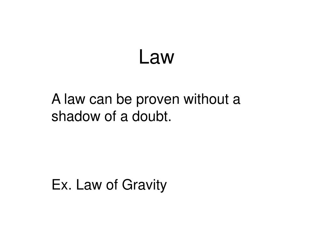 Law A law can be proven without a shadow of a doubt. Ex. Law of Gravity