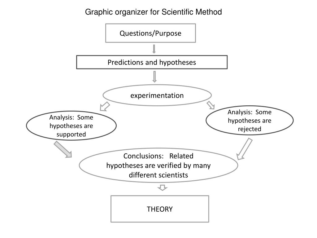 Graphic organizer for Scientific Method Questions/Purpose Predictions and hypotheses experimentation Analysis: Some hypotheses are rejected Analysis: Some hypotheses are supported Conclusions: Related hypotheses are verified by many different scientists THEORY