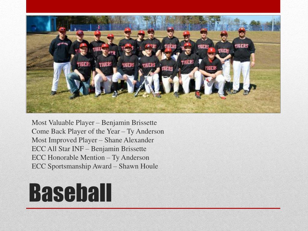 Most Valuable Player – Benjamin Brissette Come Back Player of the Year – Ty Anderson Most Improved Player – Shane Alexander ECC All Star INF – Benjamin Brissette ECC Honorable Mention – Ty Anderson ECC Sportsmanship Award – Shawn Houle Baseball