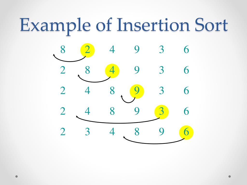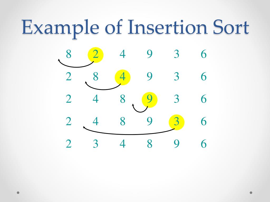 Example of Insertion Sort 8 2 4 9 3 6 2 8 4 9 3 6 2 4 8 9 3 6 2 4 8 9 3 6 2 3 4 8 9 6 2 3 4 6 8 9 done