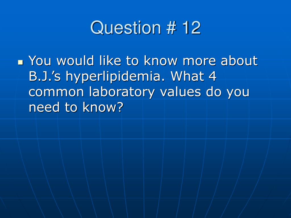 Question # 12 • You would like to know more about B.J.’s hyperlipidemia. What 4 common laboratory values do you need to know?
