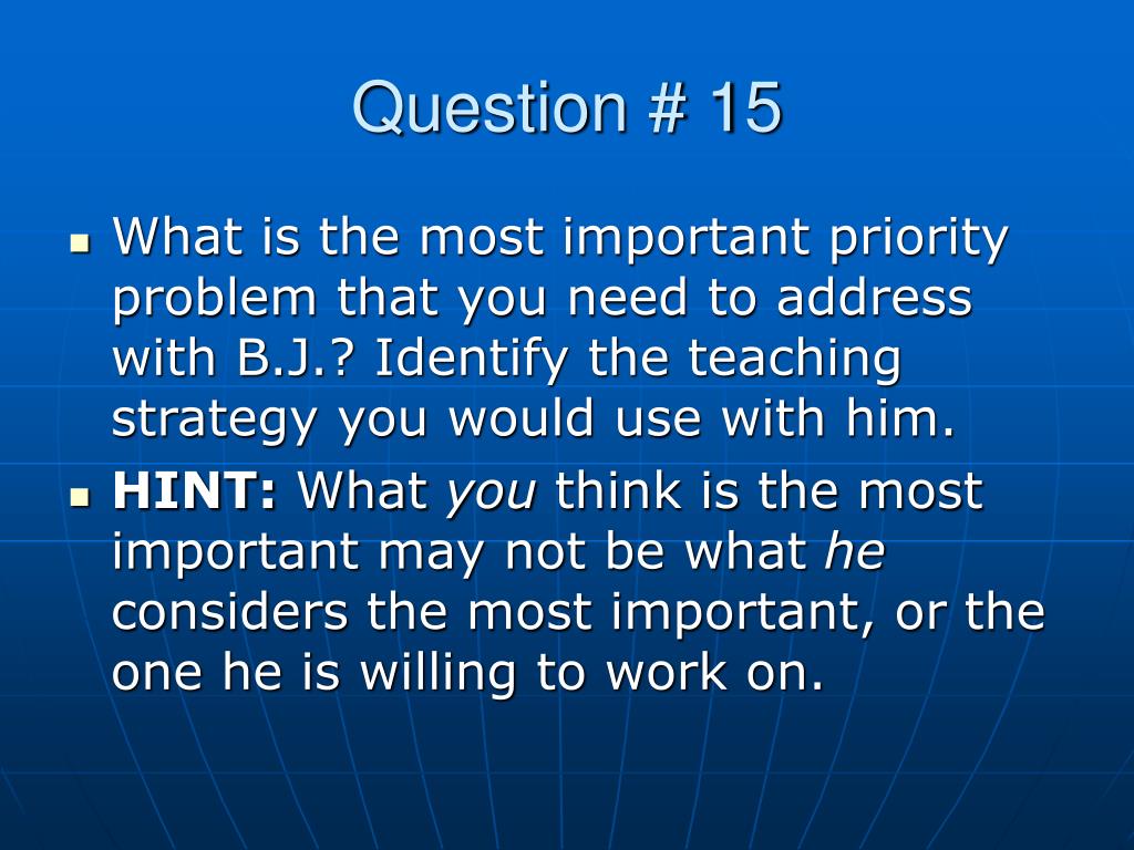 Question # 15 • What is the most important priority problem that you need to address with B.J.? Identify the teaching strategy you would use with him. • HINT: What you think is the most important may not be what he considers the most important, or the one he is willing to work on.