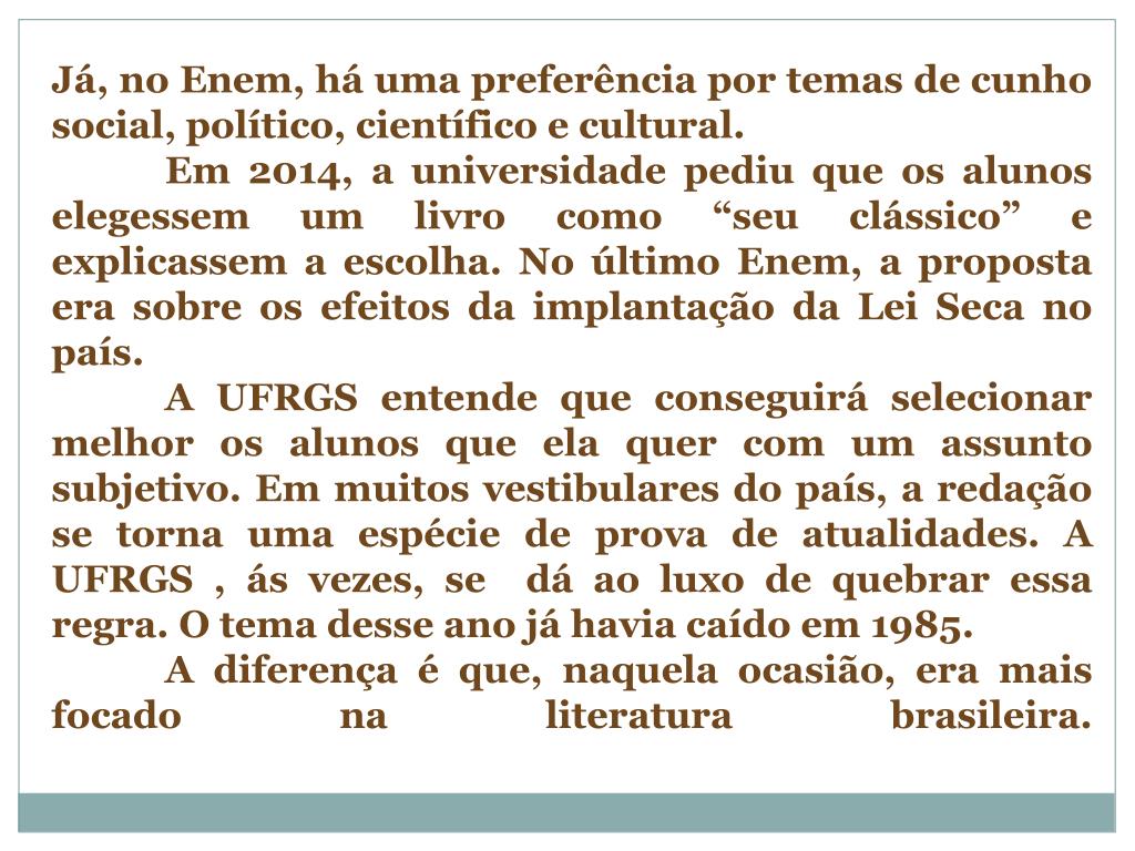 Já, no Enem, há uma preferência por temas de cunho social, político, científico e cultural. Em 2014, a universidade pediu que os alunos elegessem um livro como “seu clássico” e explicassem a escolha. No último Enem, a proposta era sobre os efeitos da implantação da Lei Seca no país. A UFRGS entende que conseguirá selecionar melhor os alunos que ela quer com um assunto subjetivo. Em muitos vestibulares do país, a redação se torna uma espécie de prova de atualidades. A UFRGS , ás vezes, se dá ao luxo de quebrar essa regra. O tema desse ano já havia caído em 1985. A diferença é que, naquela ocasião, era mais focado na literatura brasileira.