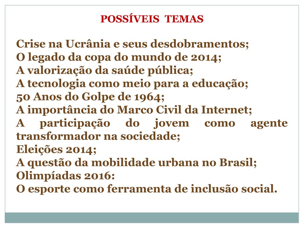 POSSÍVEIS TEMAS Crise na Ucrânia e seus desdobramentos; O legado da copa do mundo de 2014; A valorização da saúde pública; A tecnologia como meio para a educação; 50 Anos do Golpe de 1964; A importância do Marco Civil da Internet; A participação do jovem como agente transformador na sociedade; Eleições 2014; A questão da mobilidade urbana no Brasil; Olimpíadas 2016: O esporte como ferramenta de inclusão social.
