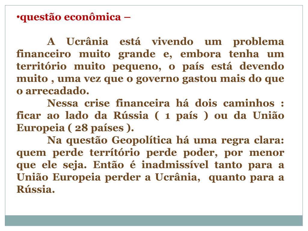questão econômica – • A Ucrânia está vivendo um problema financeiro muito grande e, embora tenha um território muito pequeno, o país está devendo muito , uma vez que o governo gastou mais do que o arrecadado. • Nessa crise financeira há dois caminhos : ficar ao lado da Rússia ( 1 país ) ou da União Europeia ( 28 países ). • Na questão Geopolítica há uma regra clara: quem perde terrítório perde poder, por menor que ele seja. Então é inadmissível tanto para a União Europeia perder a Ucrânia, quanto para a Rússia.