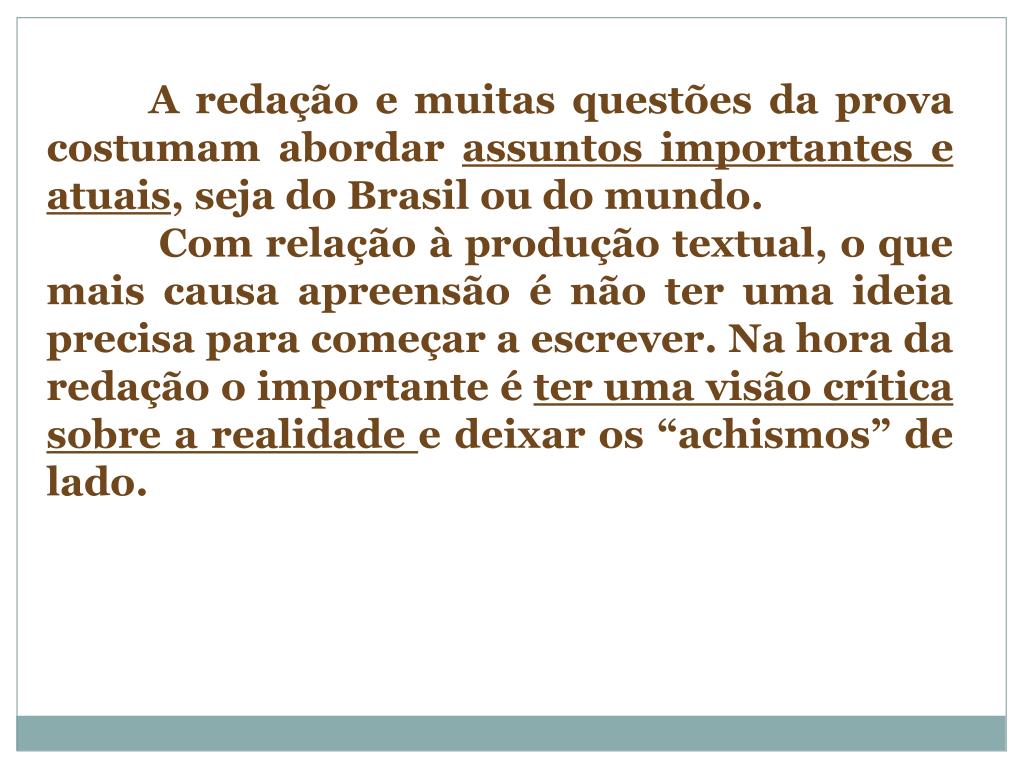 A redação e muitas questões da prova costumam abordar assuntos importantes e atuais, seja do Brasil ou do mundo. Com relação à produção textual, o que mais causa apreensão é não ter uma ideia precisa para começar a escrever. Na hora da redação o importante é ter uma visão crítica sobre a realidade e deixar os “achismos” de lado.