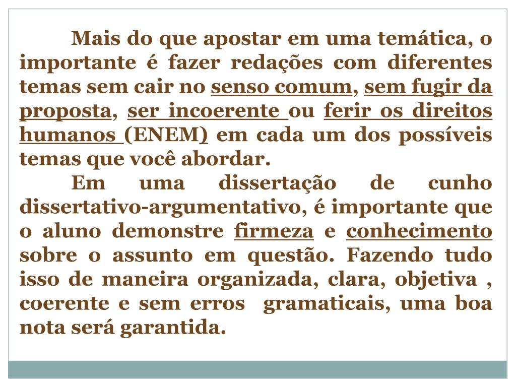 Mais do que apostar em uma temática, o importante é fazer redações com diferentes temas sem cair no senso comum, sem fugir da proposta, ser incoerente ou ferir os direitos humanos (ENEM) em cada um dos possíveis temas que você abordar. Em uma dissertação de cunho dissertativo-argumentativo, é importante que o aluno demonstre firmeza e conhecimento sobre o assunto em questão. Fazendo tudo isso de maneira organizada, clara, objetiva , coerente e sem erros gramaticais, uma boa nota será garantida.
