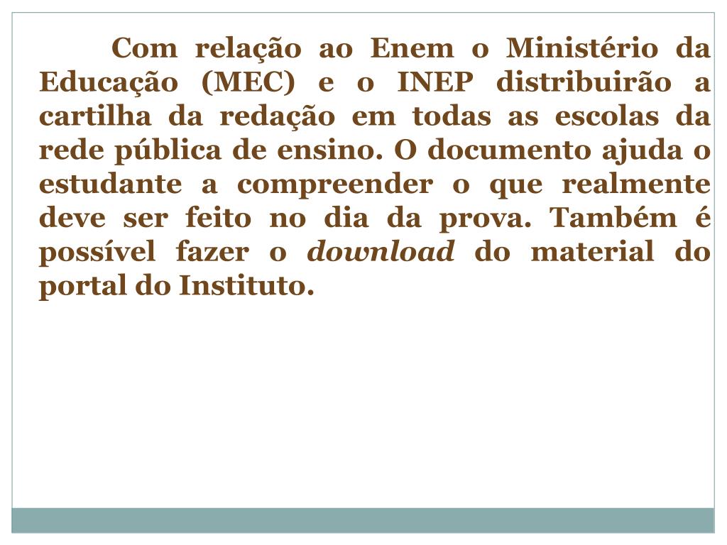 Com relação ao Enem o Ministério da Educação (MEC) e o INEP distribuirão a cartilha da redação em todas as escolas da rede pública de ensino. O documento ajuda o estudante a compreender o que realmente deve ser feito no dia da prova. Também é possível fazer o download do material do portal do Instituto.